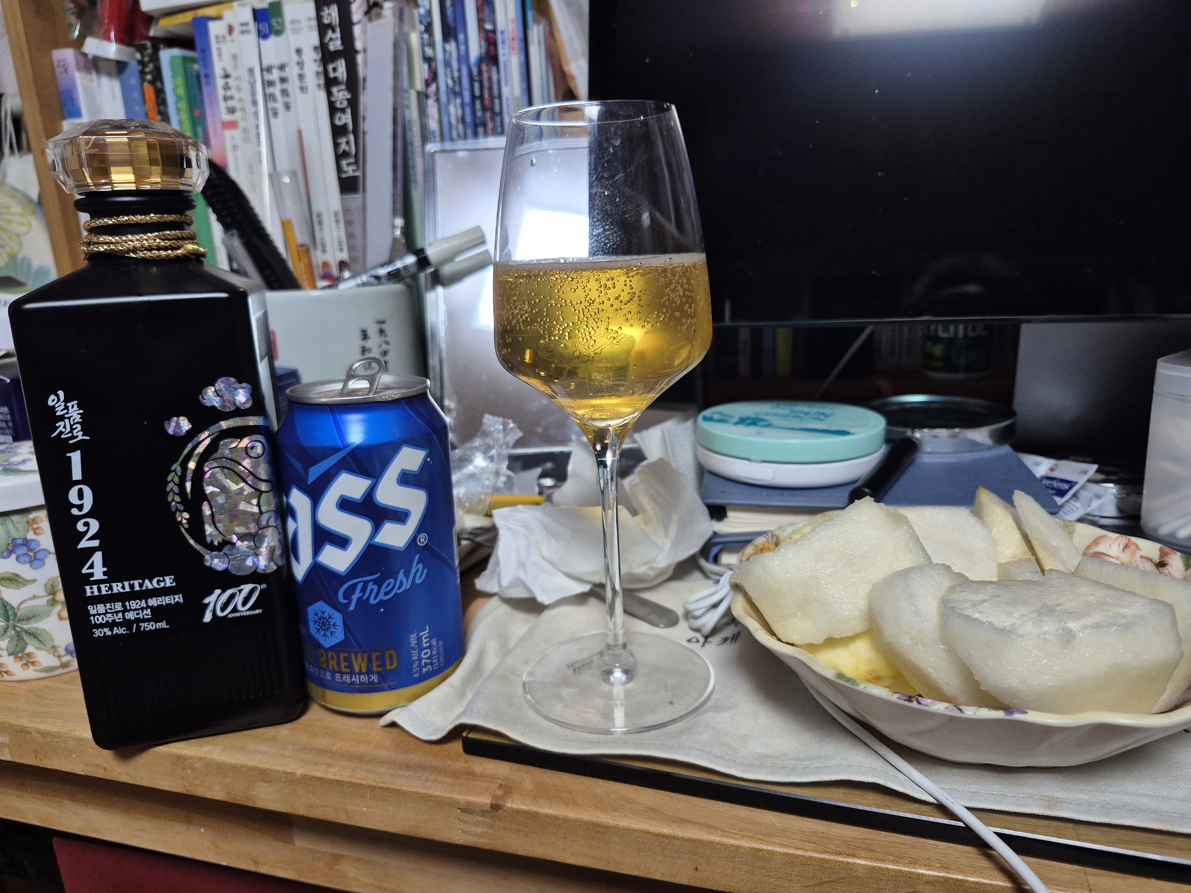 시월 들어 생각해야 할 일들이 많아서 어젯밤 늦도록 잠이 오지 않아 지난 추석 때 가족들 모임 때 마시다가 반쯤 남은 일품진로 소주와 집사람이 유효기간 지났다고 폐기 처분해야 한다며 뒤 베란다에 쌓아둔 캔맥주를 ‘술이 오래되었다고 버리는 게 어디 있느냐’라며 내가 모두 회수해서 안방 냉장고 안에 넣어둔 캔맥주를 하나 꺼내 와인잔에 소맥으로 가득 채우고 며칠 전 미륵산에 갖고 올라갔다가 되레 가져온 어린애 머리통 크기의 배를 반으로 뚝딱 잘라 반은 랩을 씌어 냉장고 안에 넣고는 반은 껍질을 깎아 소반에 담아 그렇게 책상 위에 술상이 차려졌다.