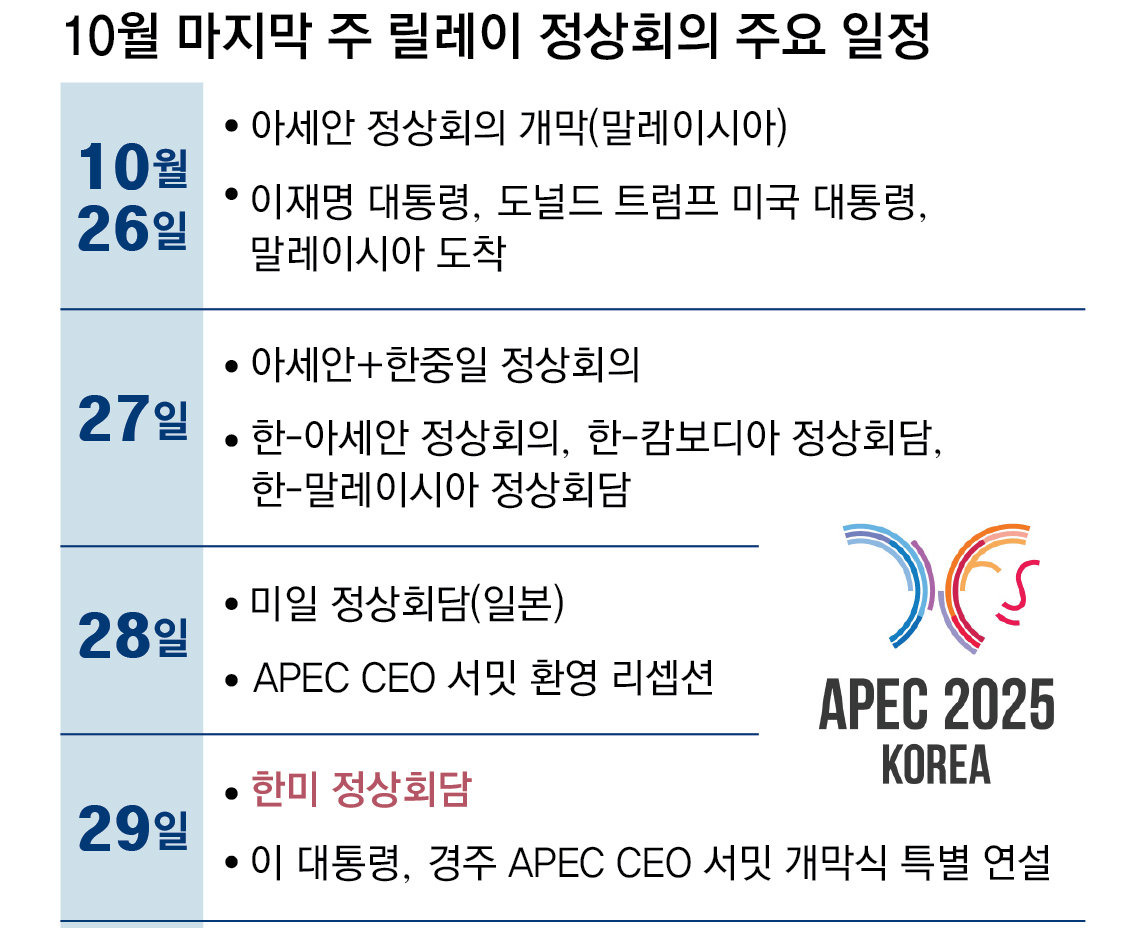 이 대통령은 APEC 정상회의 첫 일정으로 29일 오전 ‘APEC 최고경영자(CEO) 서밋 개막식’에 특별연사로 참여한 뒤 같은 날 오후 국빈 방한하는 도널드 트럼프 미국 대통령과 정상회담을 한다. 양국은 무역 협상 과정에서 ‘3500억 달러(약 504조 원) 대미 투자 펀드’ 구성을 놓고 줄다리기를 벌이고 있는 가운데, 안보 의제를 놓고는 상당한 공감대를 형성했다. 이번 정상회담에서 우선 한국의 사용후 핵연료 재처리와 우라늄 농축 권한을 확대하는 내용이 담긴 합의문이 채택될 것이라는 전망도 나온다. ‘주한미군 전략적 유연화’ 및 ‘국방비 인상’과 관련한 문구도 포함될 가능성이 크다.