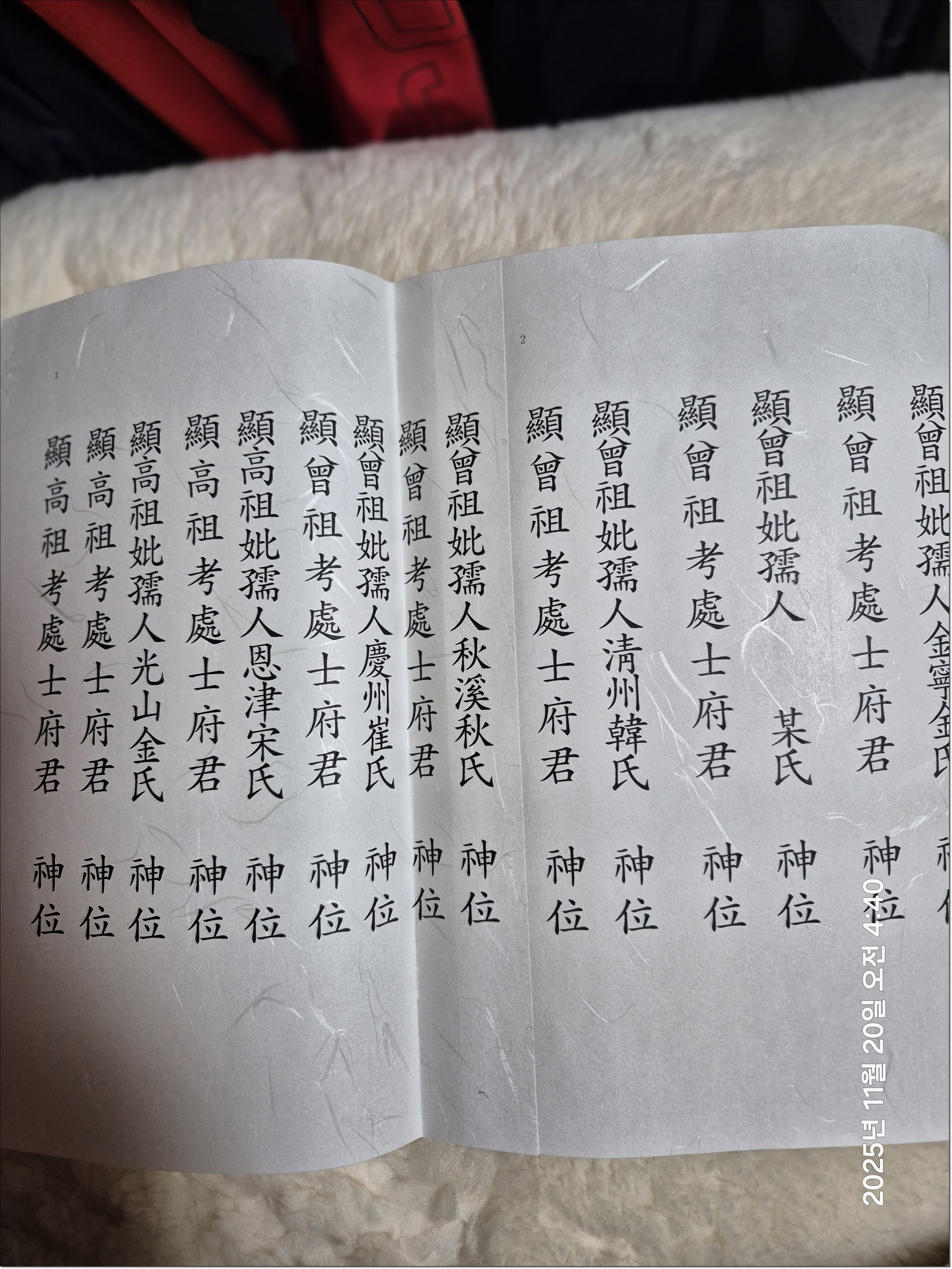 신위방 위패함에 봉안하신 선조님께옵서 강신하실 것을 삼가원하옵니다.