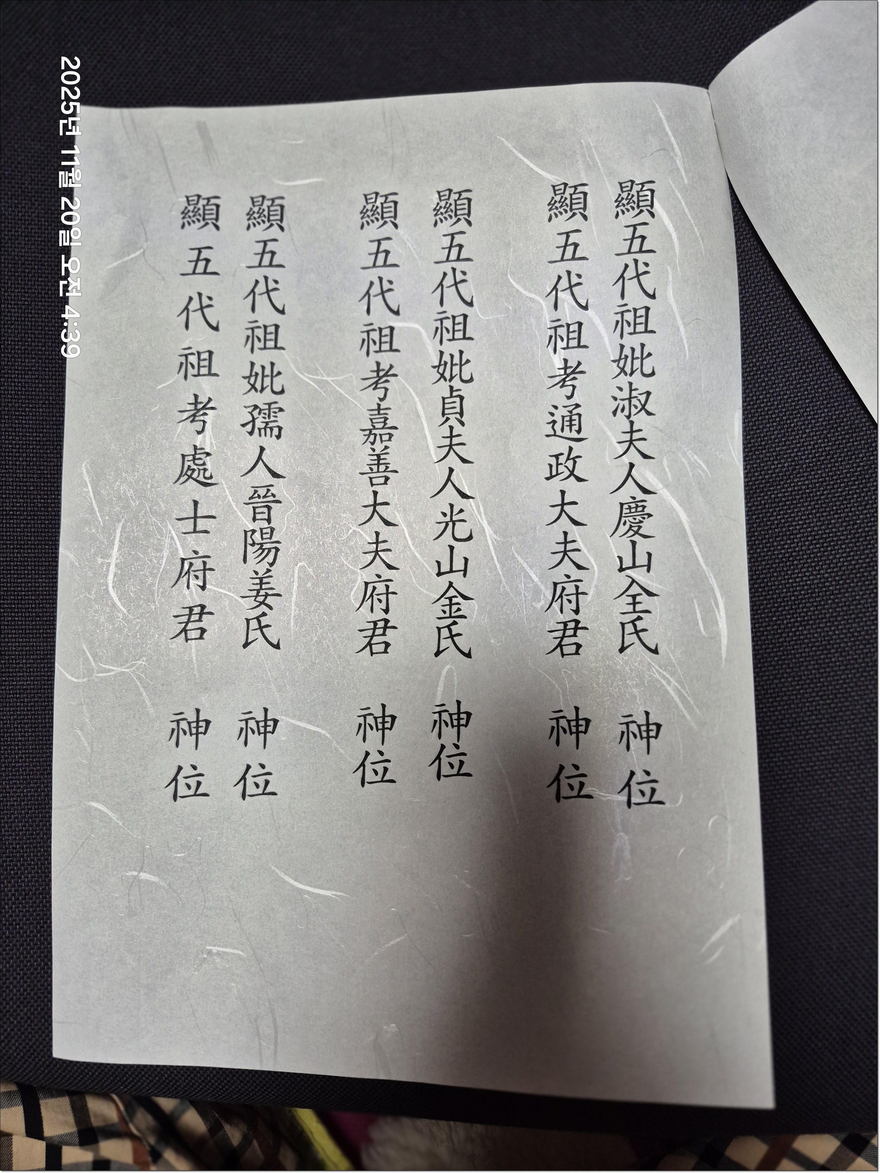 5대 조고, 조비 유인 진양강씨, 5대 조고 가선대부, 5대 조비 정부인 광산김씨, 5대 조고 통정대부, 5대 조비 숙부인 경산전씨 신위