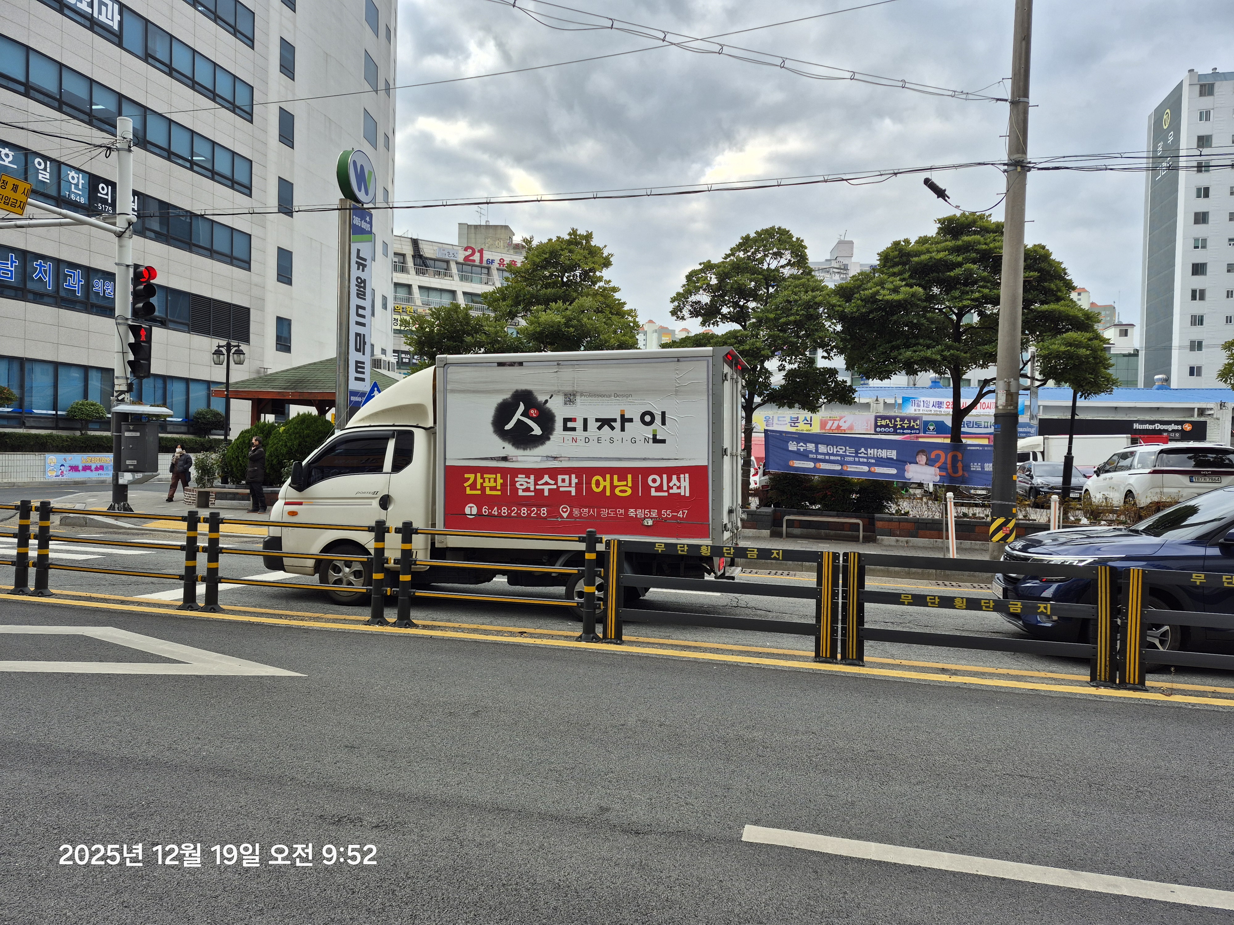 진우마리나 아파트 입구를 지나가는데 아파트 내부에서 나오던 간판 현수막 화물차가 난폭운전으로 튀어나와서 혼쭐이 났다. 예사날 같으면 귀싸대기라도 올려야 분이 풀렸을 것인데 참았다. 그래도 분을 삭이지 못해 횡단보도를 건너와서 신호대기 중인 차를 촬영해 두었다.