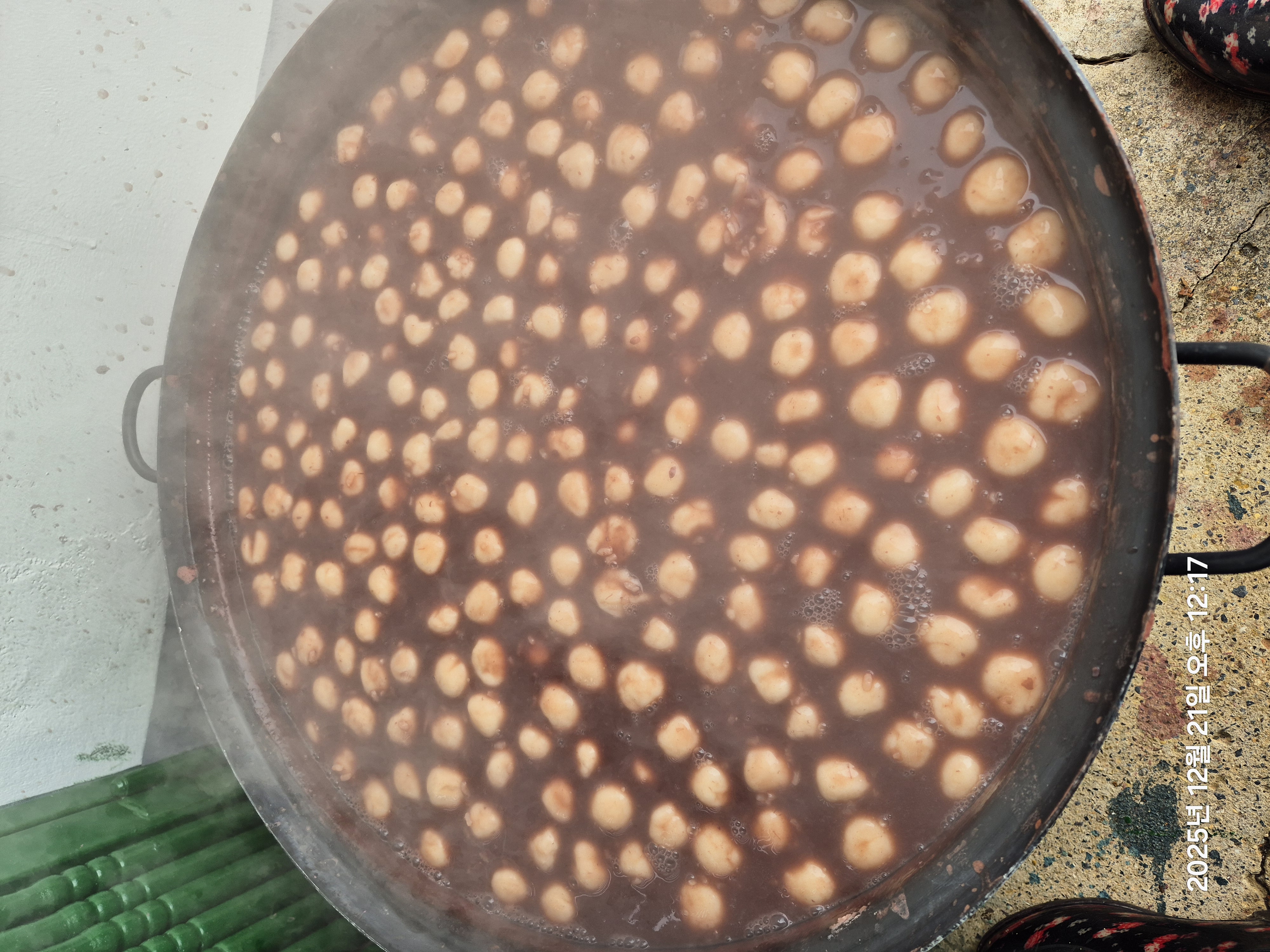 다짜고짜 중앙식자재마트로 오라고 해서 갔더니 일회용 용기를 가득 사서 들고 강여사가 나왔다. 내 차를 다른 곳에 주차를 시키고 자기 차를 타라고 했다. 가만히 눈치를 살펴보니 내일이 동지인데 동지 팥죽을 끓이러 가는 모양새였다. 고성읍 서외리에 도착했다. 가마솥에 팥이 끓고 있었다. 내린 커피를 한잔하고는 그때부터 팥물을 끓이는데 커다란 주걱으로 젓기 시작했다. 이어서 팥물이 끓기 시작하자 불린 쌀을 적당량 팥물 속에 붓고는 쌀이 눌어붙지 않도록 이때부터 신경을 바짝 써서 젓기 시작했다. 쌀이 퍼지자 이번에는 새알심을 가득 넣고 끓이기 시작하자 가라앉았던 새알심이 익기 시작하자 거짓말처럼 동동 떠오르기 시작했다.