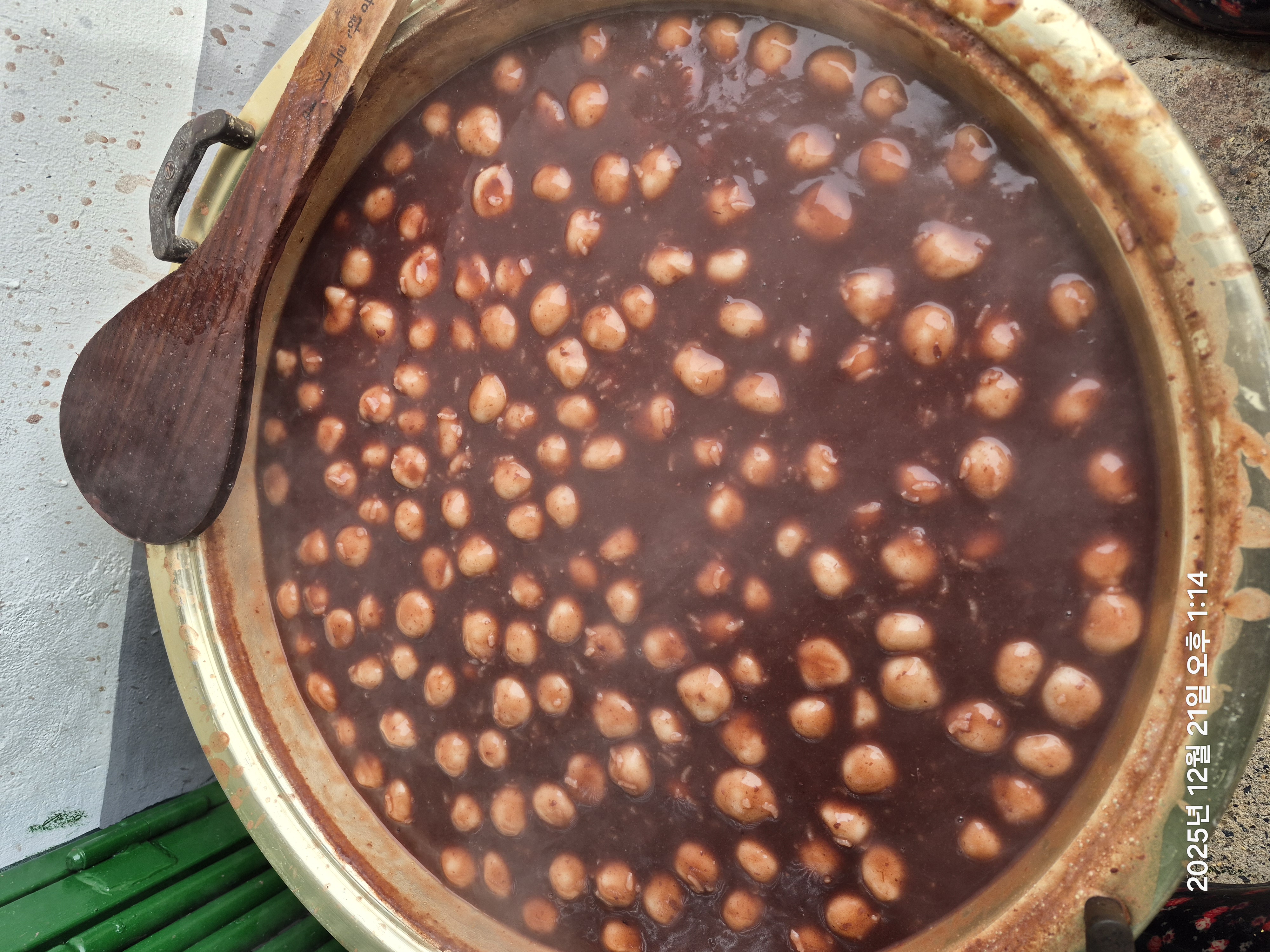 팥죽이 완성되자 솥째로 가스레인지 위에서 들어내고 이번에는 다른 팥물이 들어 있는 솥을 가스레인지 위에 올리고 끓이기 시작했다. 그렇게 가마솥 2개 그득 동지 팥죽을 끓여서 일회용 용기에 플라스틱 바가지로 퍼 담아서 식혔다. 이때 쇠로된 국자는 사용금지란다. 쇠로 된 용기를 팥죽에 넣으면 죽이 용해되어 물이 생긴다고 했다.