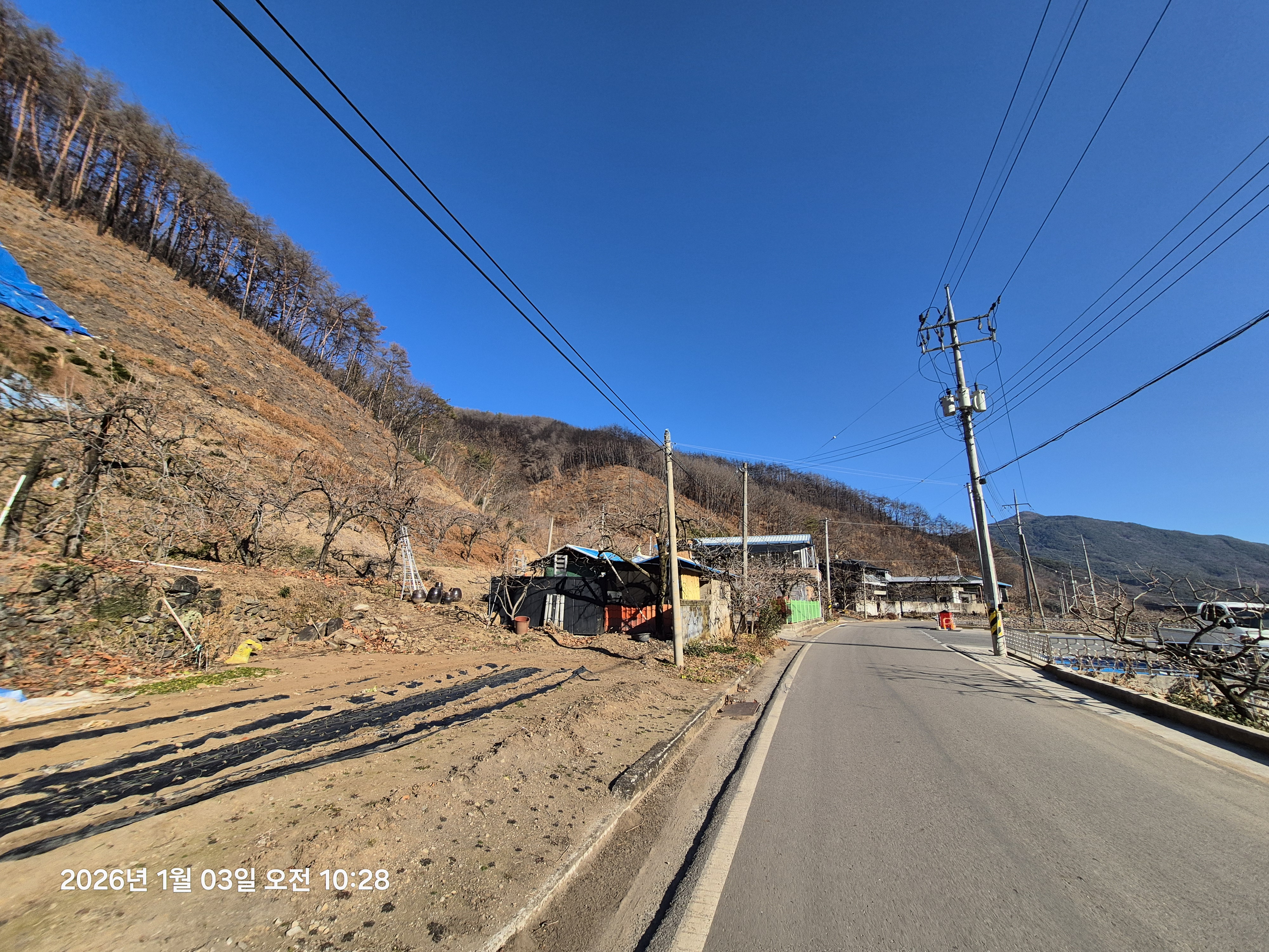 12시 방향 고사리농장 좌측 끝단에도 주택 지붕이 보인다. 고사리 농장 뒤로도 산불피해지역이다.