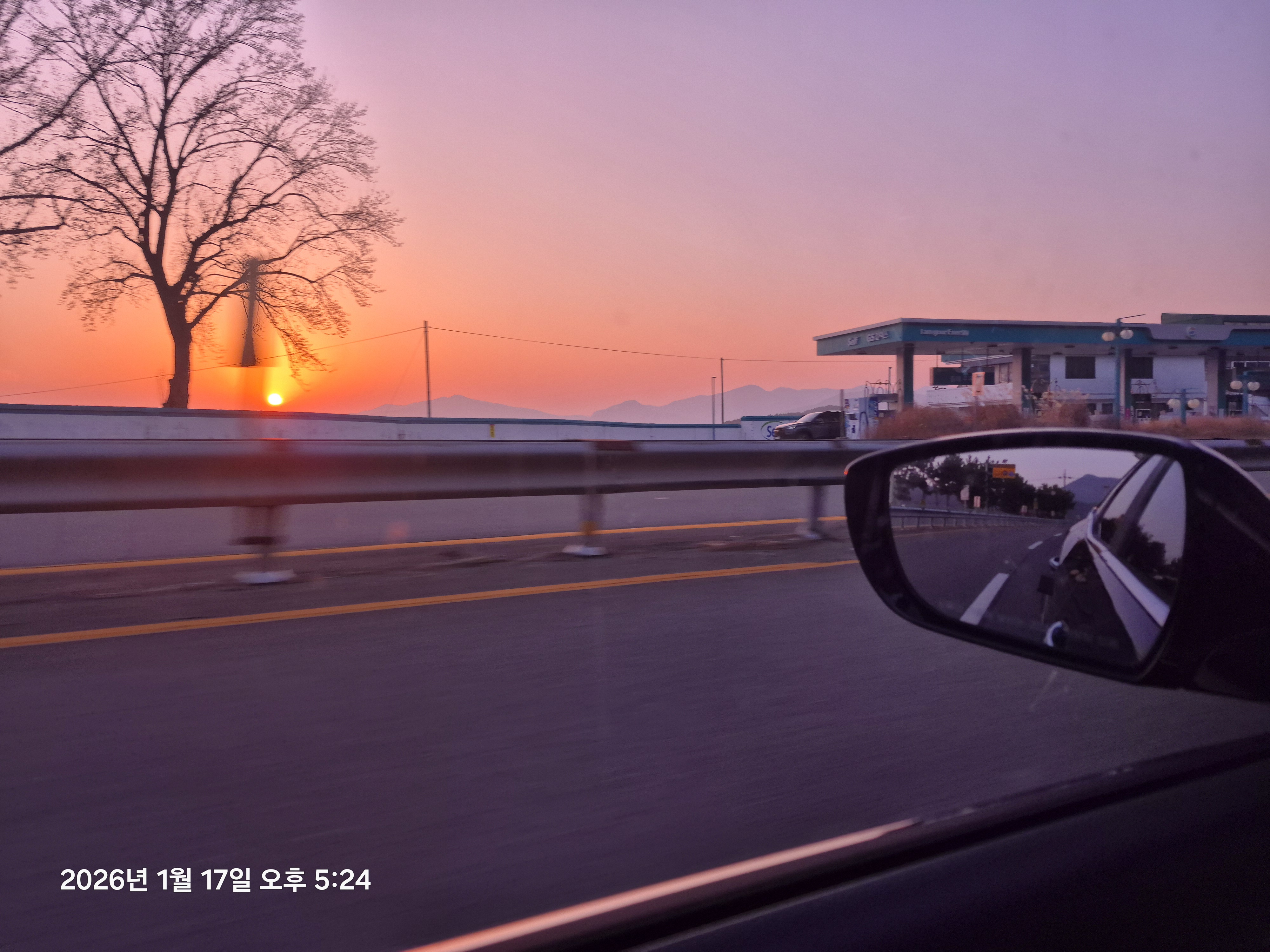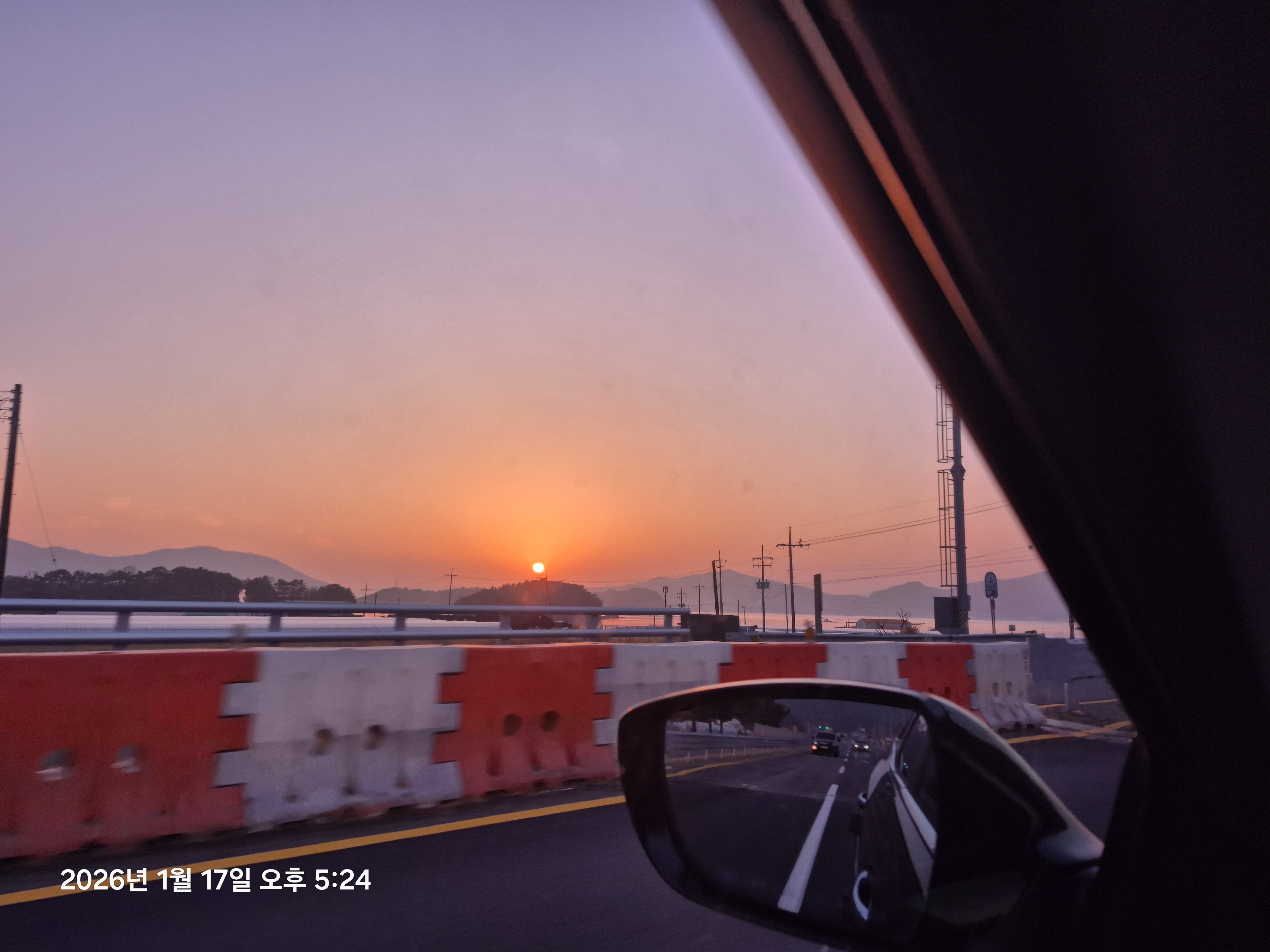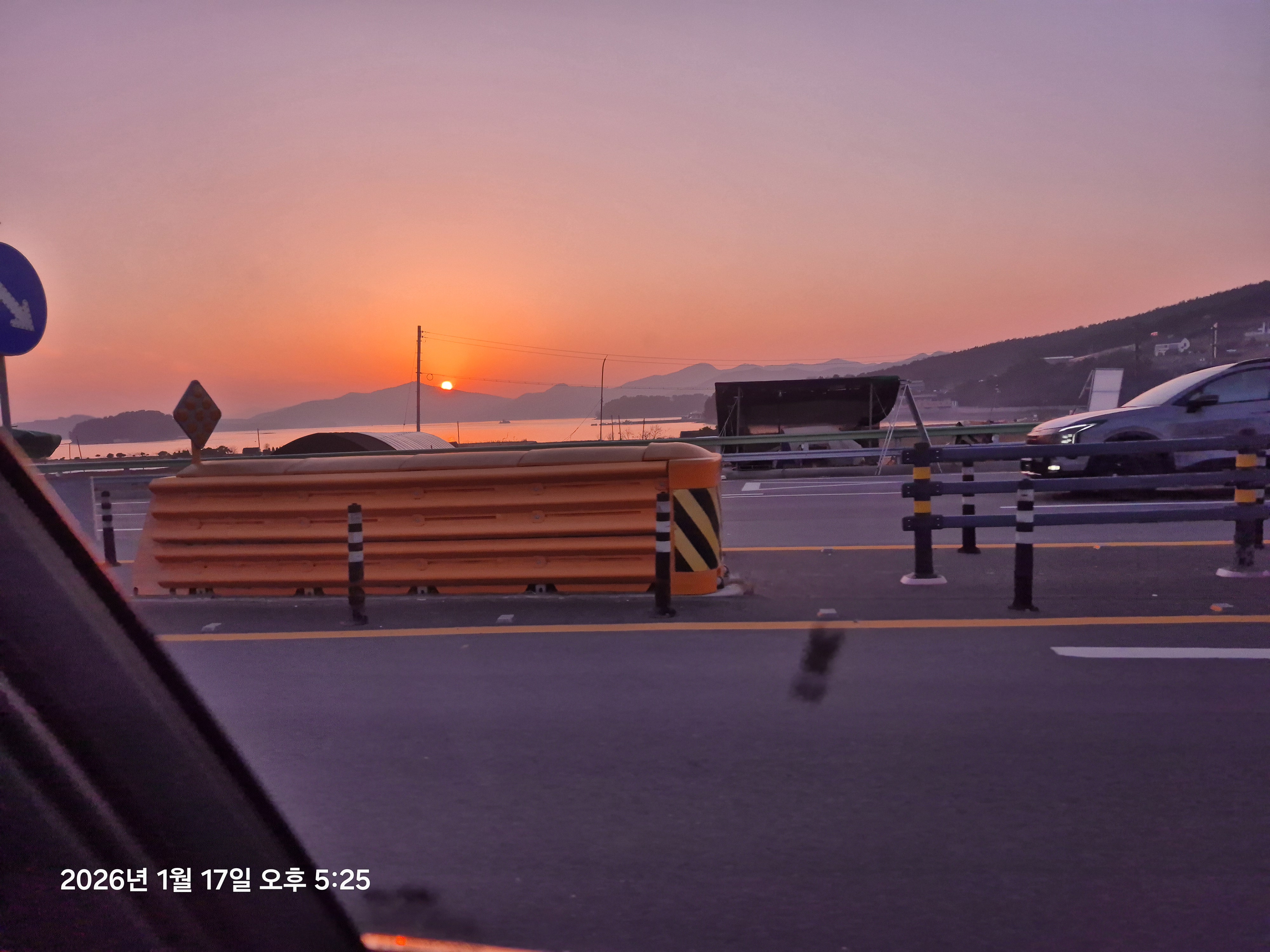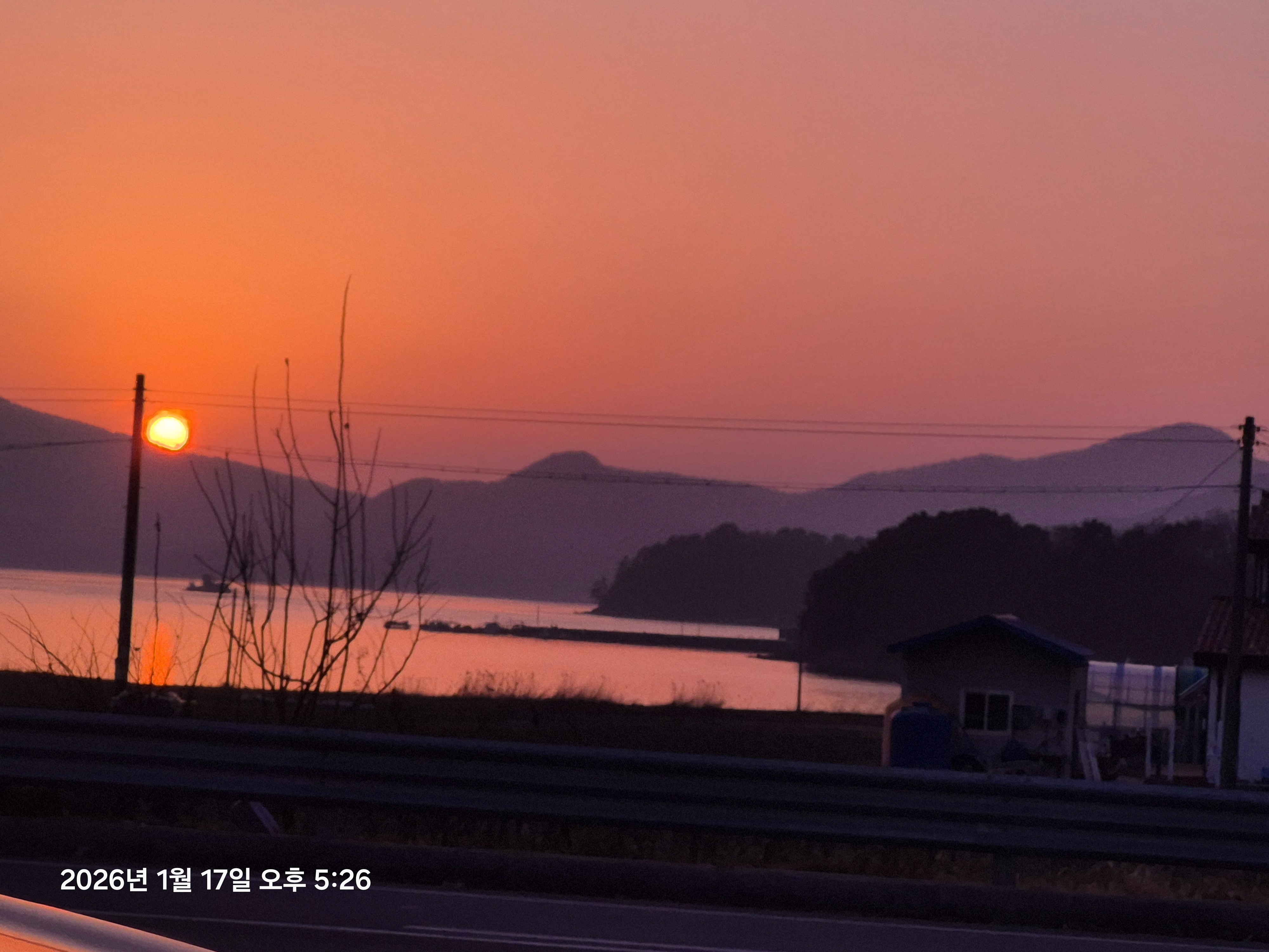 고향 마을 앞을 통과하는데 일몰 광경이 장관이었다. 운전하면서 촬영을 하지 못해 신호대기중에 음성 촬영 방식으로 몇 컷 찍었다.